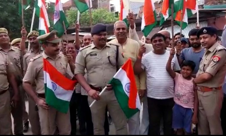 इटावा:-आज़ादी के अमृत महोत्सव के दौरान हर घर तिरंगा अभियान के तहत एसएसपी जय प्रकाश सिंह ने शहर के भरथना चौराहे पर लोगो को झंडे वितरित किये,