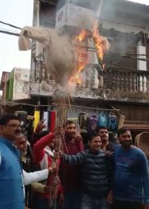 भरथना कस्बे के सब्जी मण्डी में आज बीजेपी कार्यकर्ताओ तथा नेताओं के द्वारा स्वामी प्रसाद मौर्य का पुतला फूका गया । और साथ ही कहा गया कि हम सनातनी लोग गोस्वामी तुलसीदास का अपमान कतई बर्दाश्त नहीं करेंगे । ये अपराध अक्षम श्रेणी में आता है स्वामी प्रसाद मौर्य के द्वारा उनकी छोटी सोच और संकीर्ण मानसिकता का उदाहरण दिया गया है, साथ ही इन्होंने अपने बड़बोले पन के कारण यह विवादित बयान दिया है । इसी क्रम में भारतीय जनता पार्टी के नेताओं द्वारा कहा गया कि बीजेपी एक ऐसी पार्टी है जो सभी धर्मों का सम्मान करती है, तथा प्रभु श्री राम को लेकर भारतीय जनता पार्टी के द्वारा चार प्रांतों की सत्ता कुर्बान कर दी गई थी । बीजेपी कभी भी राम को लेकर राजनीति नहीं करती है । हमारी अपनी सनातनी विचारधारा हमारी संस्कृति है । हम जिएंगे तो भगवान राम के लिए और मरेंगे तो भगवान श्री राम लिए । किंतु किसी भी परिस्थिति में अपने आराध्य प्रभु श्री राम का अपमान बर्दाश्त नही करेंगे । किंतु कुछ विपक्षी दलों के द्वारा कहा जाता है कि बीजेपी राम को लेकर राजनीति करती है । लेकिन ऐसा बिल्कुल नहीं है, बीजेपी सभी धर्मों का सम्मान करती है इस दौरान नगर के भारतीय जनता पार्टी के तमाम नेता व कार्यकर्ता मौजूद रहे। जिसमें स्वामी प्रसाद मौर्य के द्वारा रामचरितमानस को लेकर दिए गए विवादित बयान पर काफी आक्रोश दिखाई दिया ।