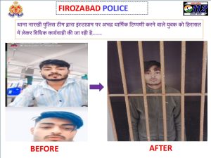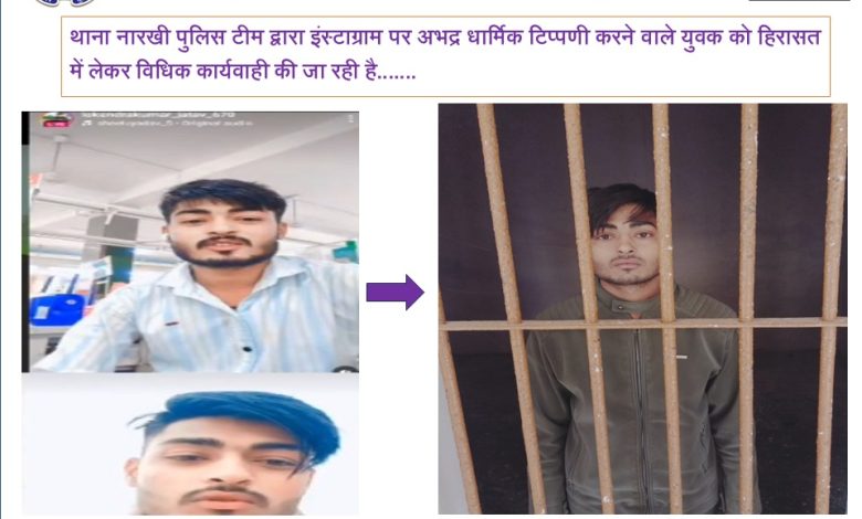सोशल मीडिया प्लेटफॉर्म इंस्टाग्राम पर एक युवक द्वारा अभद्र धार्मिक टिप्पणी की गयी थी । सोशल मीडिया सेल पुलिस टीम द्वारा उक्त सोशल मीडिया प्लेटफॉर्म पर की गयी टिप्पणी (कमैंट) का संज्ञान लिया गया । वरिष्ठ पुलिस अधीक्षक फिरोजाबाद श्री सौरभ दीक्षित द्वारा उक्त की गिरफ्तारी हेतु सम्बन्धित को निर्देशित किया गया जिसमें थाना नारखी पुलिस टीम द्वारा मामले में मुकद्दमा अपराध संख्या 04/2025 धारा 196 बीएनएस थाना नारखी पर पंजीकृत किया गया । वाँछित अभियुक्त की गिरफ्तारी के क्रम में थाना नारखी पुलिस टीम द्वारा अभियुक्त लोकेन्द्र कुमार पुत्र चोब सिंह निवासी ग्राम दौलतपुर थाना नारखी को दिनांक 05-01-2025 को ग्राम दौलतपुर से गिरफ्तार किया गया है । गिरफ्तारी के आधार पर अन्य विधिक कार्यवाही की जा रही है ।