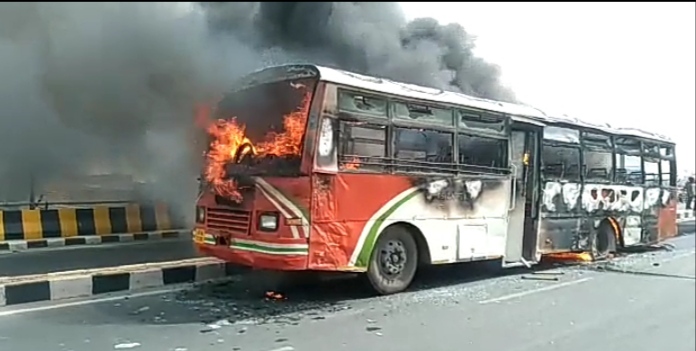 आगरा से बेवर जा रही थी बेवर डिपो की रोडवेज बस बस पूरी तरह जलकर हुई राख,